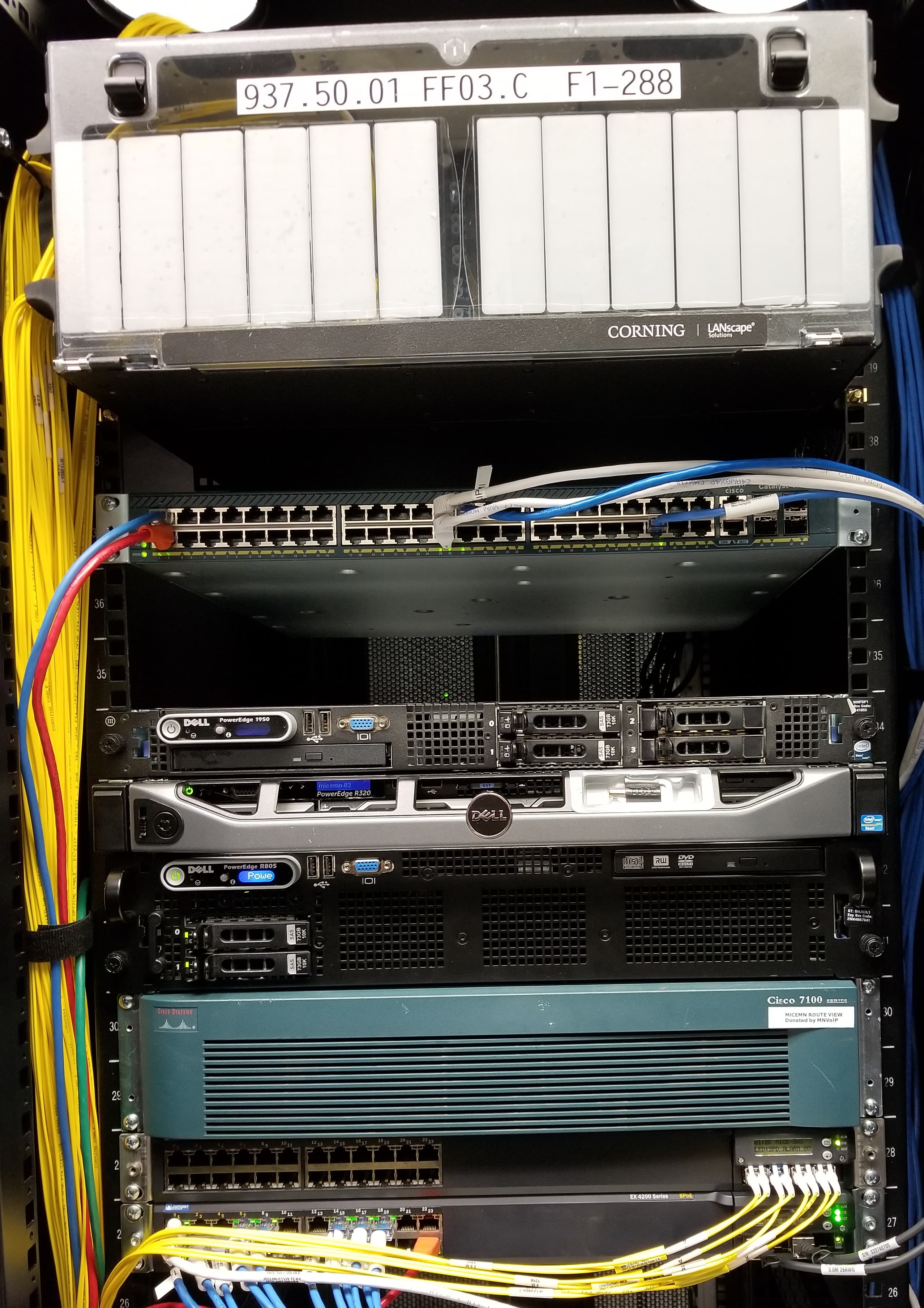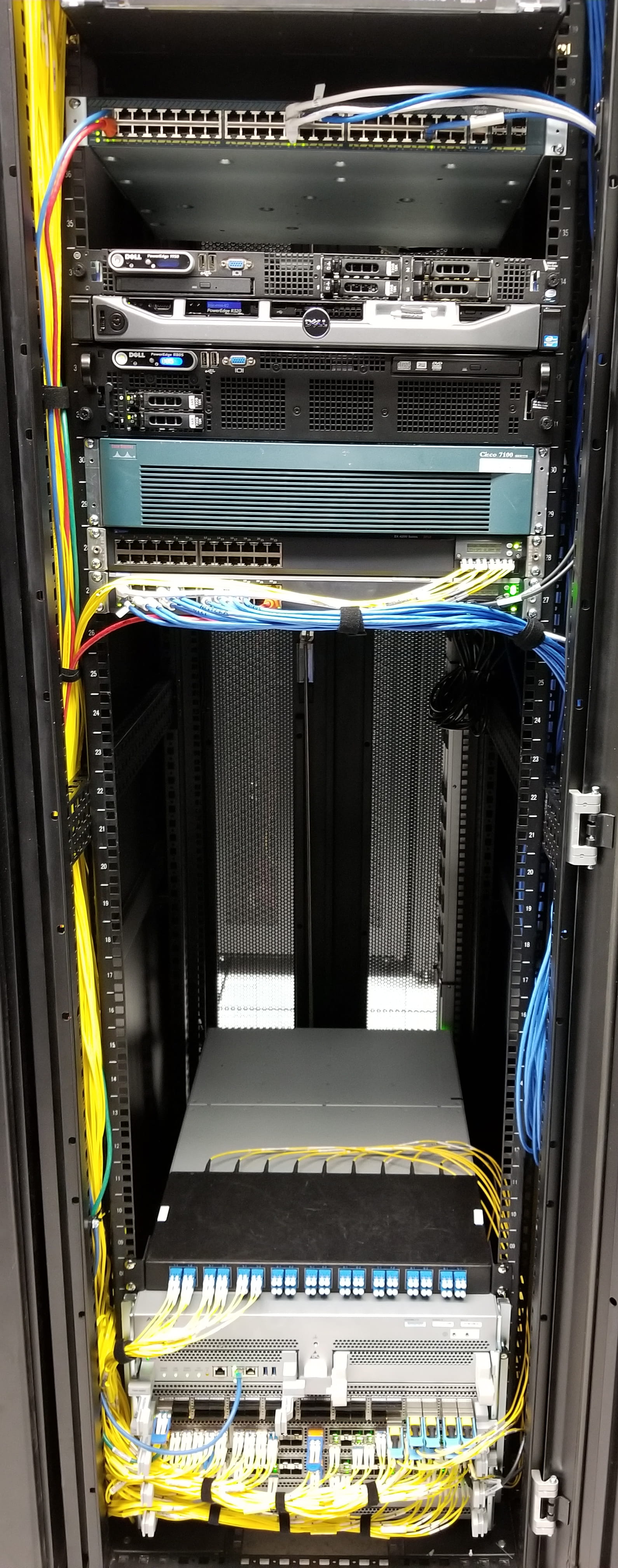 Here are some pictures of the rack, from 2017-05-10: full cabinet, switch, top of cabinet.